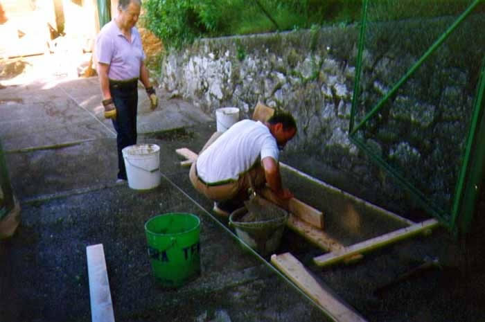 La squadra edile impegnata nella realizzazione delle rampe per il superamento della scalinata di servizio.